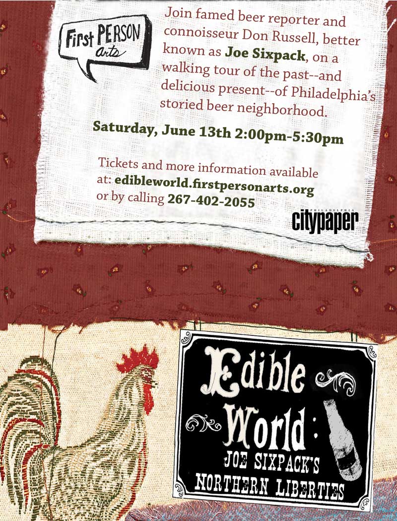 PHILADELPHIA –First Person Arts continues to tell real-life Philadelphia stories in a unique way with its Edible World Food Tour. On each quarterly tour, an expert leader uncovers the stories behind the restaurants and bars that give Philadelphia’s neighborhoods their legendary vibrancy. Next up, First Person Arts and Philadelphia’s famed beer reporter and connoisseur Don Russell, better known as Joe Sixpack, offer a tour of Northern Liberties and its many sites famous for cultivating a love of local and international artisan beers.  Beer novices and connoisseurs alike will journey Saturday, June 13 from 2-5:30 p.m. starting from The Swift Half at the new Piazza at 1002 N. 2nd St. Tickets for the event cost $75 per person, $140 per couple, and $65 for First Person Arts members and include all beer, food and gratuity. Tickets are available online at edibleworld.firstpersonarts.org or by phone at 267-402-2055.