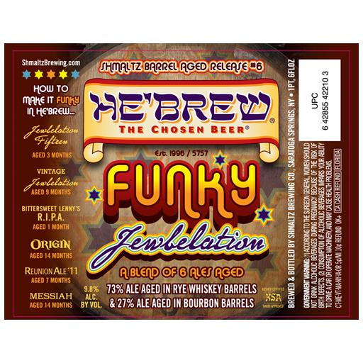 Shmaltz Barrel Aged Release #6. A blend of 6 ales aged in 73% rye whiskey barrels and 27% in bourbon barrels. The blend consists of of 3-month Jewbelation 15, 9-month Vintage Jewbelation, 1-month Bittersweet Lenny’s RIPA, 14-month Origin, 7-month Reunion Ale ’11, and 14-month Messiah.